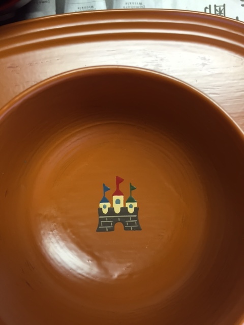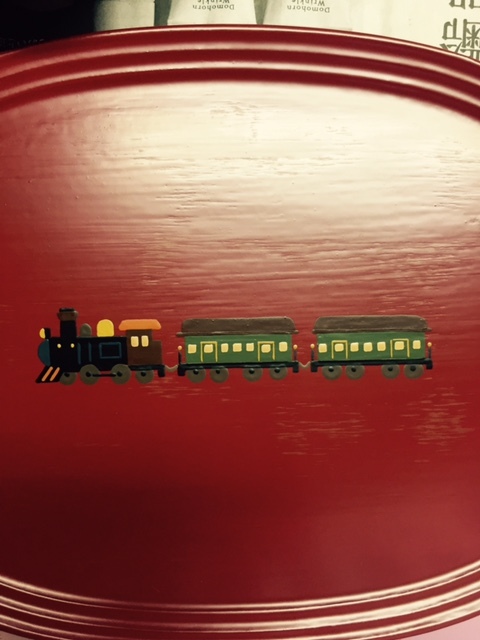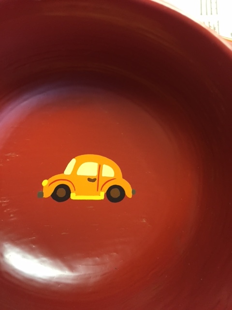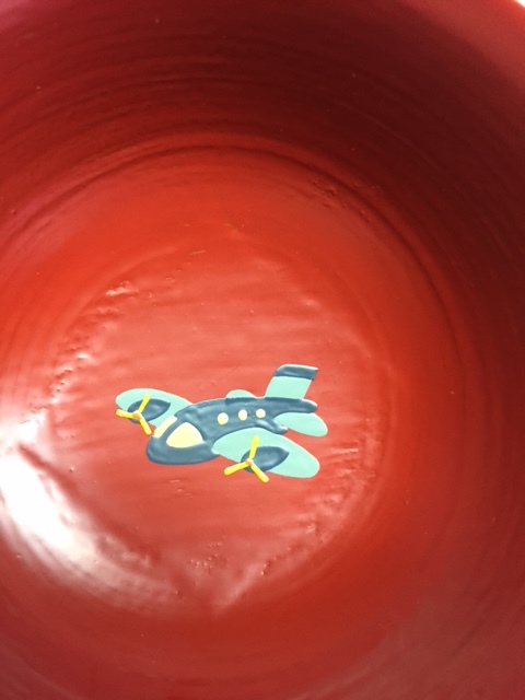 こちらも新作です。今迄のものとの違いは、機関車が客車を引いていることです。以前は石炭積載車でした。飛行機は真上から見た柄を斜めから見た感じに変更。車は色を変えました。お椀の底に四角く段差が見えるのは木地に布張りをしているからです。大きく育ってお椀が小さくなったら、ヨーグルトやアイスクリームを美味しく食べて頂けると思います。