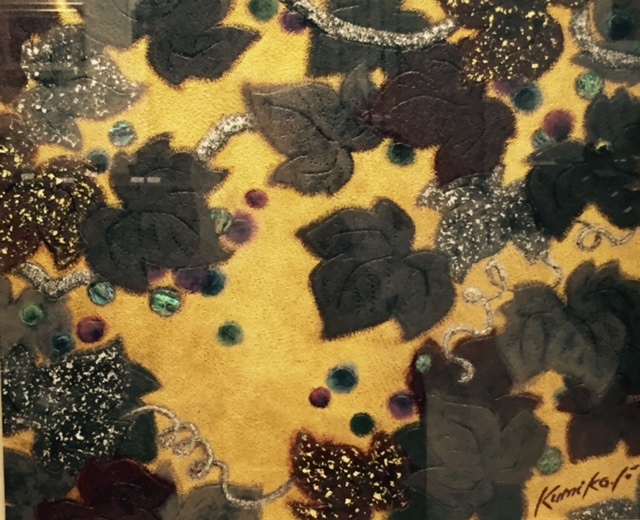 最近の作品で一番大きい額です。これからの季節に合う題材。葡萄は和にも洋にも室礼が出来る幅広い世界をもっています。メキシコ貝と金箔タタキ地にグレーの葉という配色に挑戦した作品です。